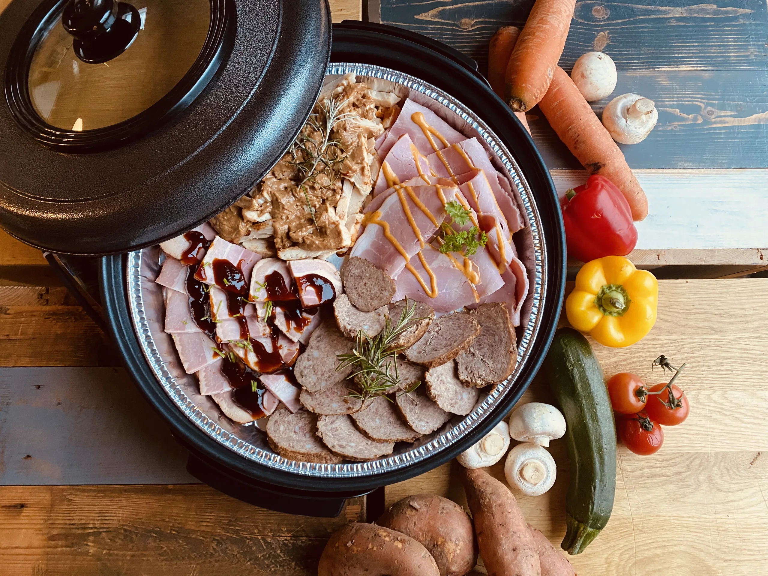Beenham met beenhamsaus, kipstukjes met satésaus, zeeuws spek met ketjapsaus, gehaktballen met mosterd, pistoletjes. Voldoende voor 12 broodjes