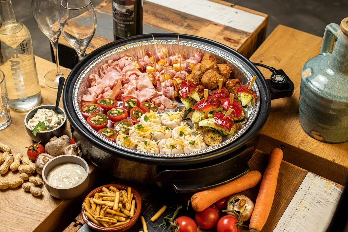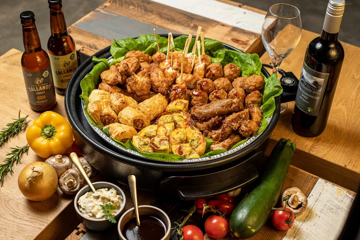 Borrelballetjes met ketjapsaus, knoflookchampignons, gevulde abrikozen met spek, aardappeltimbaaltje, eitartelettes, grillworst